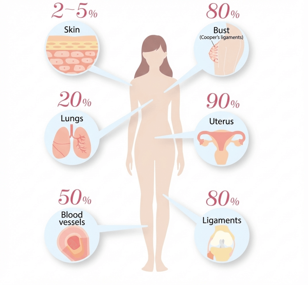 Furthermore, elastin is abundant not only in the skin but also in areas requiring flexibility and elasticity, such as the bust, uterus, and blood vessels, supporting women's beauty and health.