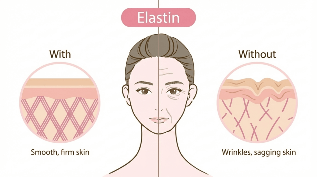 Elastin, along with hyaluronic acid and collagen, is known as one of the three major beauty ingredients.It plays a crucial role in connecting collagen fibers.