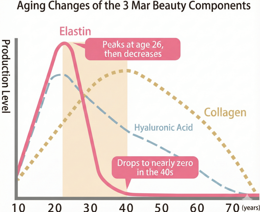 Despite its importance, the body's elastin production peaks in the mid-20s and begins to decline rapidly, reportedly reaching nearly zero by the age of 40.